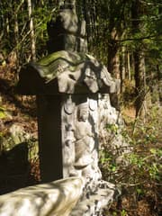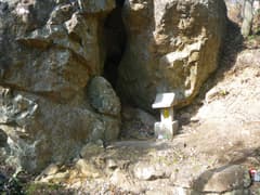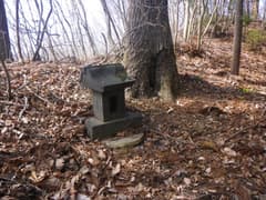 小ピークを越え、採石場から離れて雑木林に覆われた稜線となる。小さな鞍部があり、石祠を見つけた。「山主 藤生弥三兵 世話 赤石芳右ェ門 同 鹿沼文蔵」の銘があり、年号はないが、そこそこ古い感じ。採石場ができるまでは、ここに峠道が通じていたのかも。