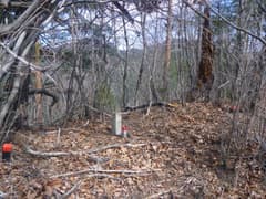 作業道終点から雑木林の尾根を少し登ると、396m三角点標石のある頂上に着く。北面を杉林、南面を雑木林に覆われて、展望は皆無。渋〜い山頂である。山名標識の類や、この辺りの三角点峰では必ずといって良い程見かけるR.K氏の標高プレートもない。