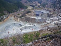 石祠から緩く登ると、採石場の縁で最高点のピークに着く。頂上から少し東に行くと、採石場の真上に出る。足元はすっぱりと切れ落ち、眼下の広大な採石場では、でかいショベルカーが何台も作業中。小平川を隔てて高倉山と赤地山がこんもりと並び立ち、殺風景だが展望が開ける。