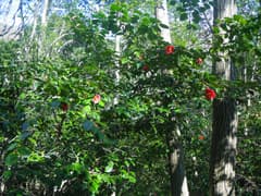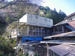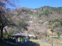 このまま稜線を北に辿れば623m三角点峰に至るが、花も見られたし、この辺で満足して下山することにする。次に東側に降りる比較的緩そうな枝尾根を下る。この尾根は藪も全くなくて歩き易い。やがて椿の林に入ると、尾根筋が不明瞭となる。暗い椿林の斜面を適当に下ると、墓地の脇から山麓の車道に出た。「小平椿園」の看板があり、先程の椿林は観光地になっている(いた)らしい。車道を下るとすぐに県道に出る。県道の手前には「小平鉱泉」の看板が掛かる廃屋と、木之宮神社がある。
