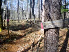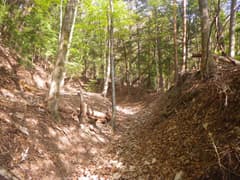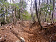 今日は良く晴れて暑い。最初からTシャツ1枚になって出発する。登山道は掘割状に深く抉れ、落ち葉がふかふかに積もっている。落ち葉に埋もれて段差の小さな丸太階段がずっと続いており、足元に気を使う。要所に道標が設置され、整備の手が良く入っているようだ。新登山道の開通後、こちらのルートは荒れ始めているという話も聞いていたが、そんなことは全然なくて、思ったよりもしっかりとした良い登山道だ。