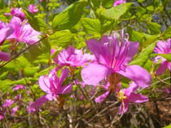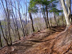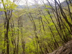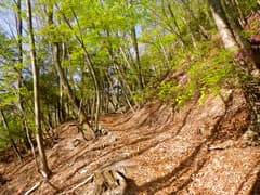鮮やかな新緑に覆われた山腹を斜めに登って行く。ところどころに紫のツツジの花が咲いて、アクセントをつける。やがて尾根の上に出て、尾根を辿って緩く登る。相変わらず掘割状の道が続く。樹林に覆われて展望はなく、左方向の木の間越しに、頂上に白い薙をもつ日向山が見える位である。