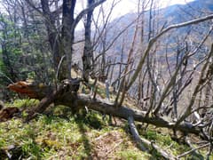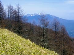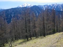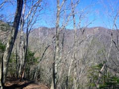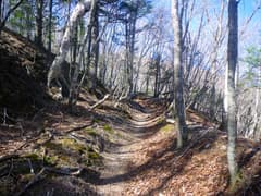 下山は往路を戻る。頂上の少し下で八ヶ岳と鋸岳も眺められる。展望はここで見納め。あとは樹林に覆われた尾根をひたすら下る。頂上直下の急斜面を降りれば、あとは緩い下りが続く。登りの倍くらいのスピードで快調に足を運ぶ。