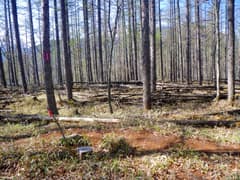 やがて、カラマツの植林に覆われた平坦な頂きに登り着く。この辺りをホクギノ平と称するらしい。掠れた文字で「←三角点」と書かれた古い標識に従って、登山道から左の枝道に入ると、すぐに三角点標石がある。少し離れた所には、新しいプレハブの作業小屋も建つ。そこにあった標識によると、サントリーが森林管理のために設置した小屋らしい。