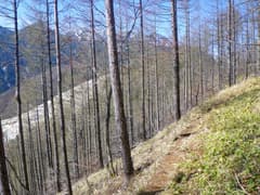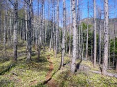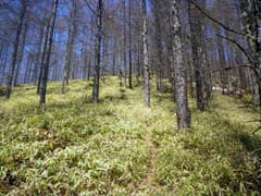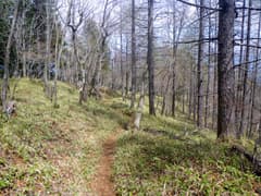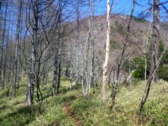 ここからは細い山道となり、黄緑の新芽が美しいカラマツ林とササの緩い尾根を辿る。林を透かして、雨乞岳の頂上を仰ぐ。右側は黒木に覆われた深い谷に急斜面で落ち、谷筋には細く雪が残っている。途中、山道は黒木の針葉樹林帯を通り抜ける。この区間で、道の上に僅かに雪が残っていた。全行程を通して、登山道上に雪が残っていたのはここだけ。