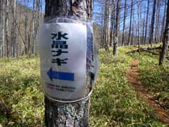カラマツ林のなだらかな山腹をトラバースすると、「←水晶ナギ 往復30分」と書かれた標識のある分岐に着く。水晶薙は景勝地らしいので、立ち寄ってみよう。