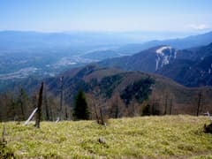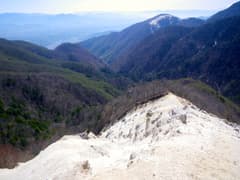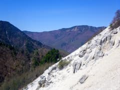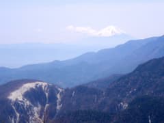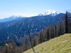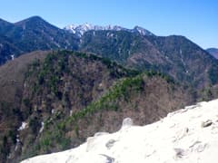 水晶薙からは南に向かって展望が開け、雁ヶ原と呼ばれる白い薙を戴く日向山(標高1660m)を手前に、奥秩父を遠くに望む。日向山から右に黒木に覆われた稜線が続き、高々と大岩山(標高2320m)を起こす。その奥にはさらに高く、鋸岳(標高2685m)が聳える。鋸岳は、白く残雪をちりばめたギザギザの稜線を連ね、かなりカッコいい。これは是非登らないといけないな。鋸岳の右には、高度を落としてなだらかな山稜が続く。地形図で見ると白岩岳(標高2267m)が見えているようだ。あちらの山も気になる。