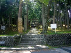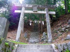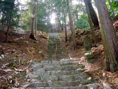 石畳の終点に土俵、無人の社務所と二つ目の石鳥居があり、その先は物凄く急で長い石段となる。ひっくり返らないように手摺をしっかり握って登る。長丁場の山行の後のこの急登は、なかなか応える。