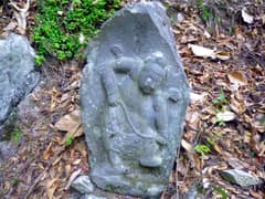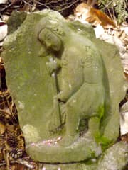 石段の脇には多数の石像が建つ。中には力士っぽい像や半身で背中を見せる像があり(下の写真)、なかなか個性的だ。後日ネットで見つけた偏平足さんの「石仏471雨乞岳(山梨)」の記事によると、これらの石像は、やはりお馴染みの不動三十六童子だった。