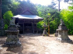 石段を登り切ると、立派な狛犬に迎えられて、石尊神社本殿の建つ小広い境内に着く。境内には多数の石像が建ち、本殿脇には大きな不動明王像が二人の童子像を従えて建つ。説明板によると、この神社の創建は応永五(1398)年で、現在の社殿は江戸時代末期に復興されたものとのこと。大山祇神と日本武尊の二神を祀り、北関東に多い石尊神社(石尊、大天狗、小天狗を祀る)とは祭神が異なる。