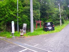 県道小平塩原線を走って、小平親水公園の少し先で林道梅田小平線が右に分岐するところに車を置く。みどり市「電話でバス」の上田バス停がある。赤鳥居の前のスペースに車を置いたが、草の中の埋もれた岩で危うく車の底を擦るところだった。注意。