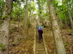 昼食後、高鳥屋山へ向かう。緩く下ると、林道梅田小平線が主稜線を乗り越す無名の峠に着く。切り通しの法面は降りられない。右側に階段があり、これを降りて車道に出る。