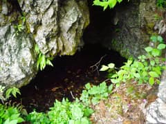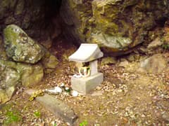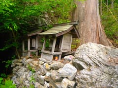車道を約300m辿ると、道に面して高い岩壁があり、杉の大木の根本に古い木の祠が二基祀られている。これが水神様だ。岩壁の基部には小さな洞があり、中に水が溜まっている。水神様は折ノ内の集落の人の信仰を集め、終戦後まで毎夏に道刈りをし、舞(ささら)が奉納されたそうだ(Kさんの水神様の記事を参照)。現在では信仰は廃れ、車で容易に来られる場所になったが、神さびた雰囲気はなお残っている。