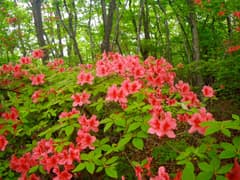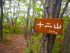 最後に少し急な斜面を上がると、赤柴山稜の主稜線に登り着く。アカマツと露岩の多い細尾根を左に辿ると、十二山の頂上に到着する。新緑とツツジに囲まれて、ハイトスさんが3月に新調された山名板がつやつやに光る。少々早い時刻だが、ここで昼食。缶ビールを分けて乾杯。Kさん差し入れのご馳走を頂いて、ゆっくり過ごす。