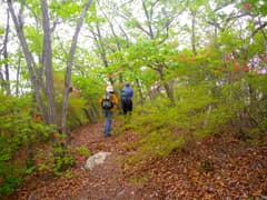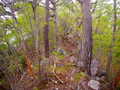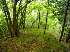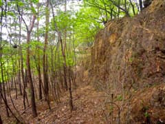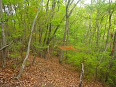 頂上から先は一旦下り、小さく尾根を上下すると、左側の斜面が段々に削り取られた尾根となる。古い採石場の跡のようだ。段の部分を通るが、若い雑木や松の幼樹が密に生えて藪っぽい。採石場を通過すると、新緑の雑木林と杉の植林の尾根が続き、歩き易くなる。