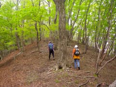 尾根は樹林に覆われて展望はほとんどない。踏み跡等は皆無だが藪もなく、歩くのに差し支えはない。晴れていれば新緑が奇麗な時期だが、今日は生憎の曇り空。梅雨時のような重たい雰囲気の天気である。