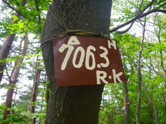 車道を横断し、反対側の法面を左側から登る(右側にも「駒見登山口」の道標がある)。再び主稜線に上がって、疎らな雑木林の中を進む。この辺りは尾根が緩やかで歩き易い。程なく、三角点標石とR.K氏の標高プレートがある高鳥屋山に到着する。樹林に囲まれて展望はなく、静かな頂きである。