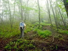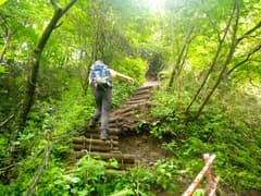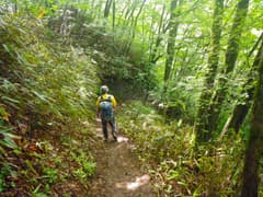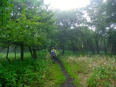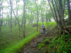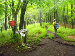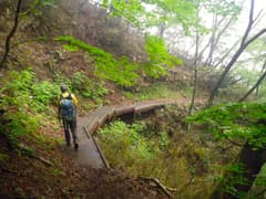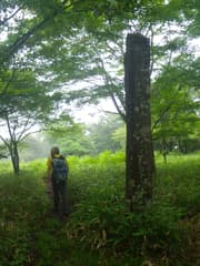 荒船山への登山道は駐車場の奥から通じており、県境稜線の長野県側を緩く絡んで進む。樹林の緑が瑞々しい。天気はまあまあ。ときおり陽も射して、ハルゼミが盛んに鳴いている。3週間振りの山歩きはやはり気持ち良い。意外とアップダウンがあり、蒸し暑さも加わって、すぐに汗をかく。群馬県側は切れ落ちており、稜線上を辿る個所ではそちらから吹き上がって来る冷風で涼むことができる。