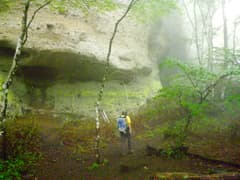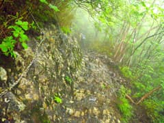 標高が上がると雲の中に入って、辺り一面の白いガスに覆われる。やがて大きな岩壁の基部に登り着く。岩屋があり、上から岩壁を伝って水が落ちている。ここが、鋏岩修験道場跡らしい。岩屋の中には石造物は見当たらない。登山道は岩壁を右から巻いて登る。少し先の道端に「持堅婆…」と彫られ、下部を欠いた石碑がある。