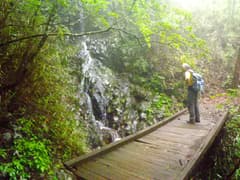 ブナ林の稜線を登ると「一杯水」の看板があり、岩壁を割って小滝が流れ落ちている。木橋が架かり、そこから水を汲むには短い距離だが滑り易い岩壁を伝う必要があって、ちょっと使い難い水場だ。