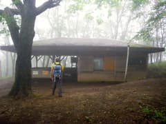 平坦な頂上台地に登り着くと、艫岩の休憩舎がある。張り紙によると、今年、予定されていた休憩舎の改修工事は、諸般の事情により延期されたらしい。ということで、休憩舎は、ベンチ部分は使用可で雨宿りもできるが、その他WC等は現在閉鎖中となっている。