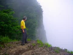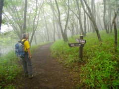 すぐ先の艫岩の岩頭に行くが、ガスに包まれて展望は皆無。岩壁の下を覗き込んでも真っ白でなーんにも見えない。少し休んだら、経塚山に向かおう。