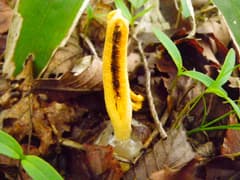 登山道に戻って先へ進む。直ぐ先にも大きな石祠があり、宗教的モニュメントが結構ある。ふと気がつくと、ズボンの腿の上をでかいオレンジ色の毛虫が這ってる!一瞬、血の気が引いたが、触れないようにして振り落とす。池に近づくために笹を漕いだとき、くっついたようだ。毛虫を落とした辺りの地面を見て、変な形のキノコを発見した。まあ、怪我?の功名かな。