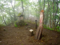 艫岩から平坦で広い頂上台地の上を歩く。左に相沢への登山道(これも未踏だ)を分け、小沢を渡る。ここの水はバンバン流れていて、まあまあ飲める。脇に石祠があるのは、水神様だろうか。