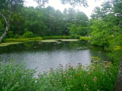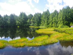 ここから四十八池を巡る歩道に入る。行く手に深い緑に覆われた志賀山がこんもりと盛り上がる。標高差約240mだから、楽に登れるだろう。歩き始めてすぐに渋池と言う大きな池が現れる。開けた水面に横手山を映し、なかなかの景勝地だ。