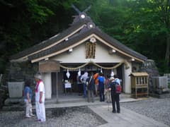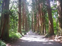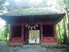 一直線に延びる参道を奥に進むと、重厚な藁葺き屋根を持つ随神門に着く。この先には見事な杉並木が続く。説明板によると、1612年(江戸時代初期)に植樹されたクマスギとのこと。