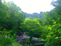 参道は段々傾斜を増し、最後は石段を汗をかきながら登ると、戸隠神社奥社に着く。ここから見上げる戸隠連峰は大岩壁を巡らせて覆い被さるように聳え立ち、迫力がある。