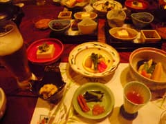 早速、温泉につかる。風呂は幾つもあり、僅かに硫黄臭のするいい湯。もちろん源泉掛け流し。さっぱり汗を流し、夕食でビールを飲んでご馳走を食べたら、例によって速攻で眠くなり、早々に爆睡してしまった。