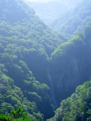 志賀高原へ上がる途中で、潤満(かんまん)滝を見物する。駐車場から滝見の展望台はすぐ。深いV字谷を隔てて滝を眺める。遠望となるが、それでも大瀑布であることが分かる。