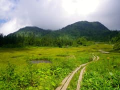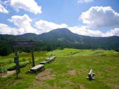 ようやく急降下が終わって笹原の中の木道となり、四十八池との分岐に出る。あとは往路を前山のリフト乗り場に戻る。