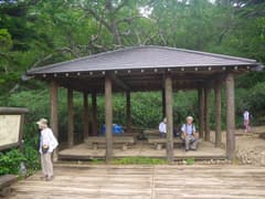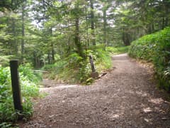 樹林帯に入り、緩く登る道がしばらく続くと、四十八池と志賀山の分岐に着く。まずは右の四十八池への道を辿る。コメツガやオオシラビソ、ネマガリダケに覆われた山腹をトラバースすると、四十八池の南端に着く。WCと東屋があり、ベンチでは数組のハイカーさんが休憩している。