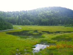 四十八池の中の木道を辿る。池塘を鏤めた湿原の向こうには裏志賀山と志賀山の二峰がこんもりと盛り上がり、絵になる風景だ。湿原に咲く花を撮影したり、振り返って鉢山を眺めながらのんびり歩く。小さな湿原なので、横断して北端まで行くのは約10分程である。