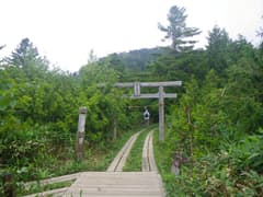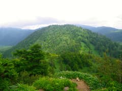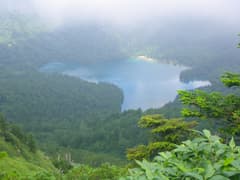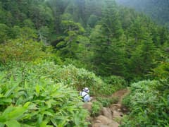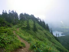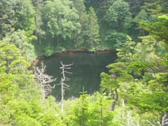 ここから笹原の斜面を急降下する。眼下には森林に囲まれたお釜池がある。眺めは良いが、足元は岩がゴロゴロなのでよそ見しながらの歩きは禁物。急坂を下って針葉樹林に入り、なおも下る。こちらを登りにとるのは大変そうだ。