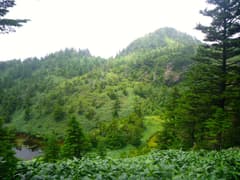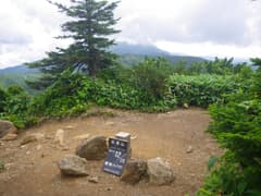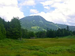 という訳で、志賀山に向かう(結果的にはこちらで正解)。樹林とササ原の斜面を鞍部に向かって下る。鞍部は笹原の中に点々と針葉樹を配し、池もあって庭園風だ。北を眺めると、発哺温泉や焼額山が眺められる。雲がだいぶ広がって来て、遠望は霞み始めた。