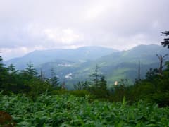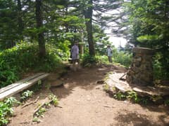 昼食後、頂上から少し進むと五葉松という標識のある地点で、ベンチと展望盤がある。ただし、樹林に囲まれて、展望は中野市街方面が見えるくらいである。