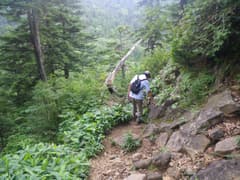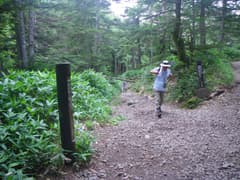 S&Sの待つ分岐に戻る。S&Sは、分岐で休憩していた他のハイカーさんから、志賀山の下りは険しいですよ、と聞かされて戻りたがったが、ここまで来たら進むも戻るも同じでしょう(件のハイカーさんも山に慣れてない感じで、少々大げさ)。