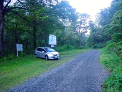 まだ着かないのかと心配になる程走って、ようやくピンネシリの砂金沢コースの登山口に着く。100m程先に登山者用駐車場があり、ここに車を置く。他の車はない。大きな案内板があり、それによるとピンネシリとはアイヌ語で「男の山」という意味があり、隣の標高1002mの山は「女の山」を意味する待根尻(マツネシリ)山と呼ばれているそうだ。