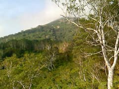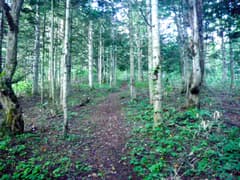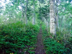 少し傾斜が増して、「山頂まで3km あわてるなようやくこれで半分だ」という道標がある。確かに思ったより距離が長い。ダケカンバ林と笹原が現れ、段々傾斜がきつくなる。木の間から、行く手にマツネシリが結構高く聳えているのが眺められる。