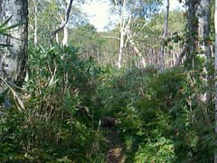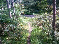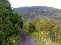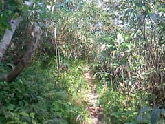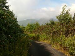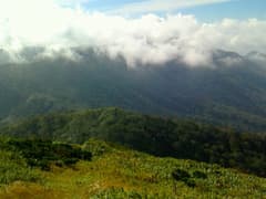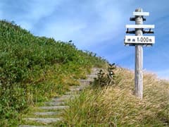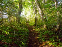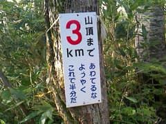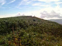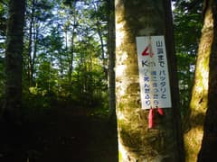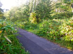 道は良いし、登りは緩くて楽だが、展望と変化には乏しく、いささか単調。「山頂まで5km 急がずゆっくり守ろうマイペース」、その次には「山頂まで4km ばったりと熊にあったら死んだふり」という道標が出てくる。熊へのこの対応はちと疑問(^^;)。これを過ぎると、尾根を越える舗装道(後述のレーダ管理用道路)を横断する。