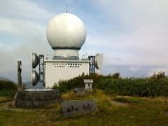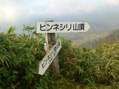 登り着いたピンネシリの頂上には、三角点標石の他に、石祠や「山神」と刻まれた石碑、展望指示盤がある。また、少し下がった場所に大きな球体のレーダドームがでんと建つ。これは「ピンネシリレーダ雨雪量観測所」で、野趣を少々削がれる思いがあるが、重要な施設であることは間違いないから文句は言えない。