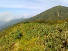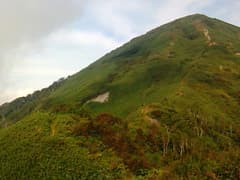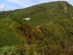 腰を落ち着けて展望を楽しみたいところだが、風がまともに当たって寒く、長居はできない。ピンネシリに向かおう。鞍部に戻り、稜線を進んでピンネシリの笹原の斜面を登る。