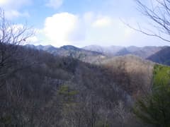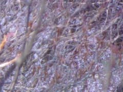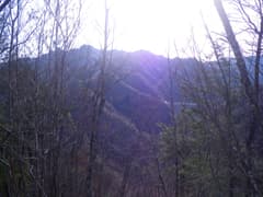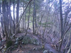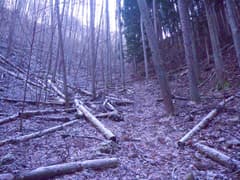 尾根を歩いていると、突然、右下の斜面をガサガサと駆け下る黒く大きな獣一頭を目撃。これは!間違いなくクマだ。少し下ったところで止まり、林の中からこちらの様子をジッと窺っている。写真を撮ってみたが、おわかりいただけただろうか。離れているので危険は感じないが、熊鈴を持っていなかったので、パッタリ遭う可能性もあった。