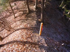 黄色い標識に従って送電線巡視路(至る安曇幹線2号線211号)を辿る。落ち葉に埋もれた道型を辿って浅い窪を登り、斜面をジグザグに登って尾根の上に出る。右が品塩山への尾根、左の小ピークには何かの観測所らしき鉄製の小屋が建つが、用途は不明。