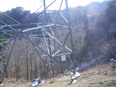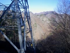 稜線を辿って巡視路に合流し、ほどなく送電鉄塔(神流川線6)に着く。送電線が延びる両方向に眺めが開け、東には諏訪山、西には船坂山が眺められる。しかし、眺めが良い分、風当たりが強くて、この場所も休憩にはいまいちだ。