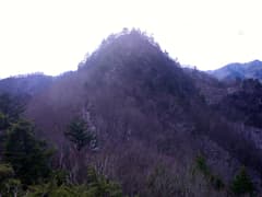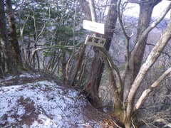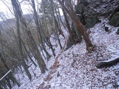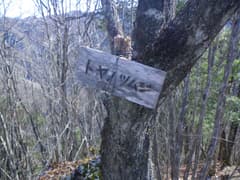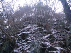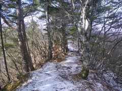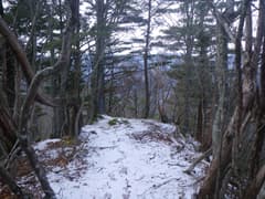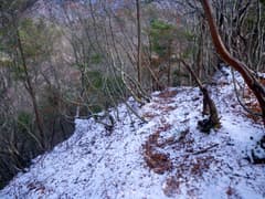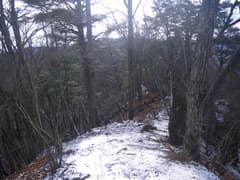 鞍部からは、さっき見て取った通りの急な登りとなる。岩場を交えた急坂は確たる手掛かりや足場に乏しく、固く凍った土にうっすらと積もった雪のせいで滑りやすい上に、結構高度感がある。四つん這いになり、マジで必死に登って、ようやく平坦な頂上稜線の北端に出る。登ってきた急坂を振り返って見下ろすと、うわー、ここを降りるのは勘弁かも。登りに増して恐ろしい。さっきの人はよくぞ下ったものだ。軽アイゼンとロープを持ってくるべきだった。