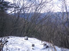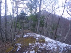 トヤノツムジからさらに細尾根を辿る。小さなアップダウンが続く。西側の斜面にはうっすらと雪が積もって白くなっている。短い急坂を上ると、標石が二つあるピークに着く。この辺りから、尾根上にもサラサラの顆粒状の雪が薄く積もっている。雪の上には微かな靴跡があり、先行者がいるようだ。